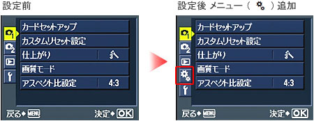 初期設定では、カメラの詳細な設定をおこなう 「カスタムメニュー」 は、オフ (非表示) になっています。