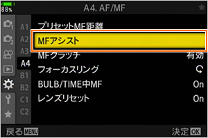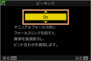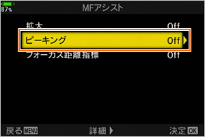 この機能は、あらかじめ MFアシスト設定で、ピーキングの設定を [On] にしておくと使えます。また、ピーキング表示の輪郭の色なども変更できます。