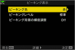 [ピーキング色] 、[ピーキングレベル]、[ピーキング背景の輝度調整] の 3項目で、ピーキング表示を変更できます。