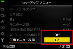 (セットアップメニュー) の 「工事メニュー表示」 をOn にします。