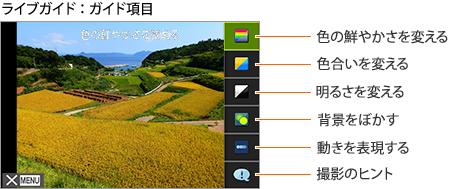 カメラまかせで撮影するため、一部の機能を除き、設定の変更はできませんが、ライブガイドを使って、色合いや明るさ、ぼかしなどの効果の設定ができます。