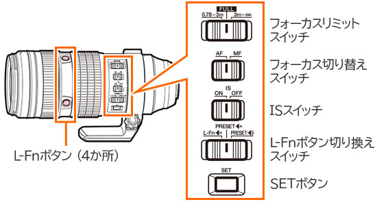 プリセットフォーカス機能は、L-Fnボタン切り換えスイッチを [PRESET フォーカスの設定がオートフォーカス / マニュアルフォーカスどちらの場合も、L-Fnボタンを押すと SETボタンで記憶したピント位置へフォーカスが移動します。 記憶したピント位置の情報は、新たにピント位置を記憶するまで保持します。